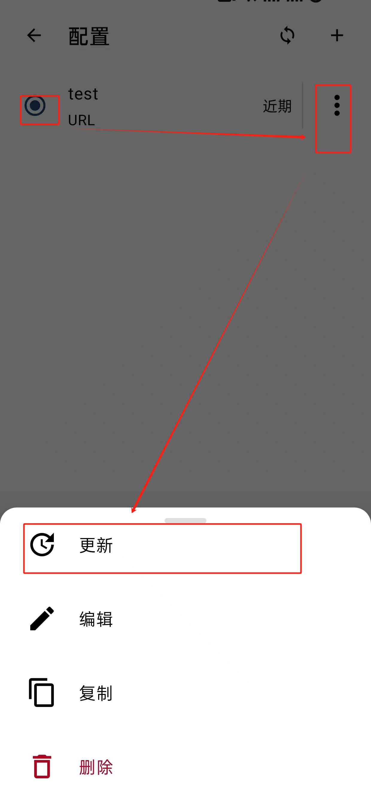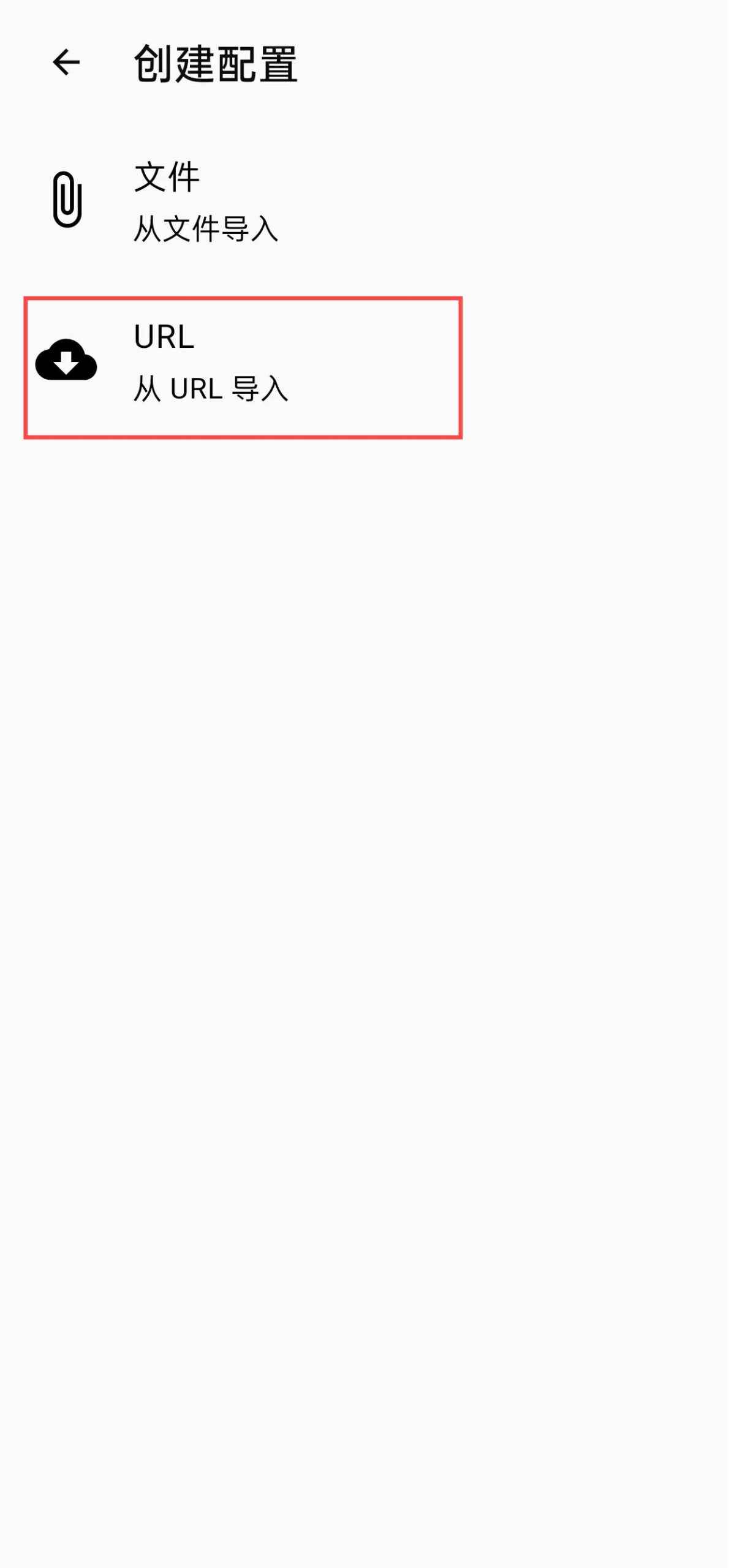 复制机场订阅地址,打开 Clash for Android 客户端,点【配置】按钮,再点右上角【+】并选择【从URL导入】,如下图所示: